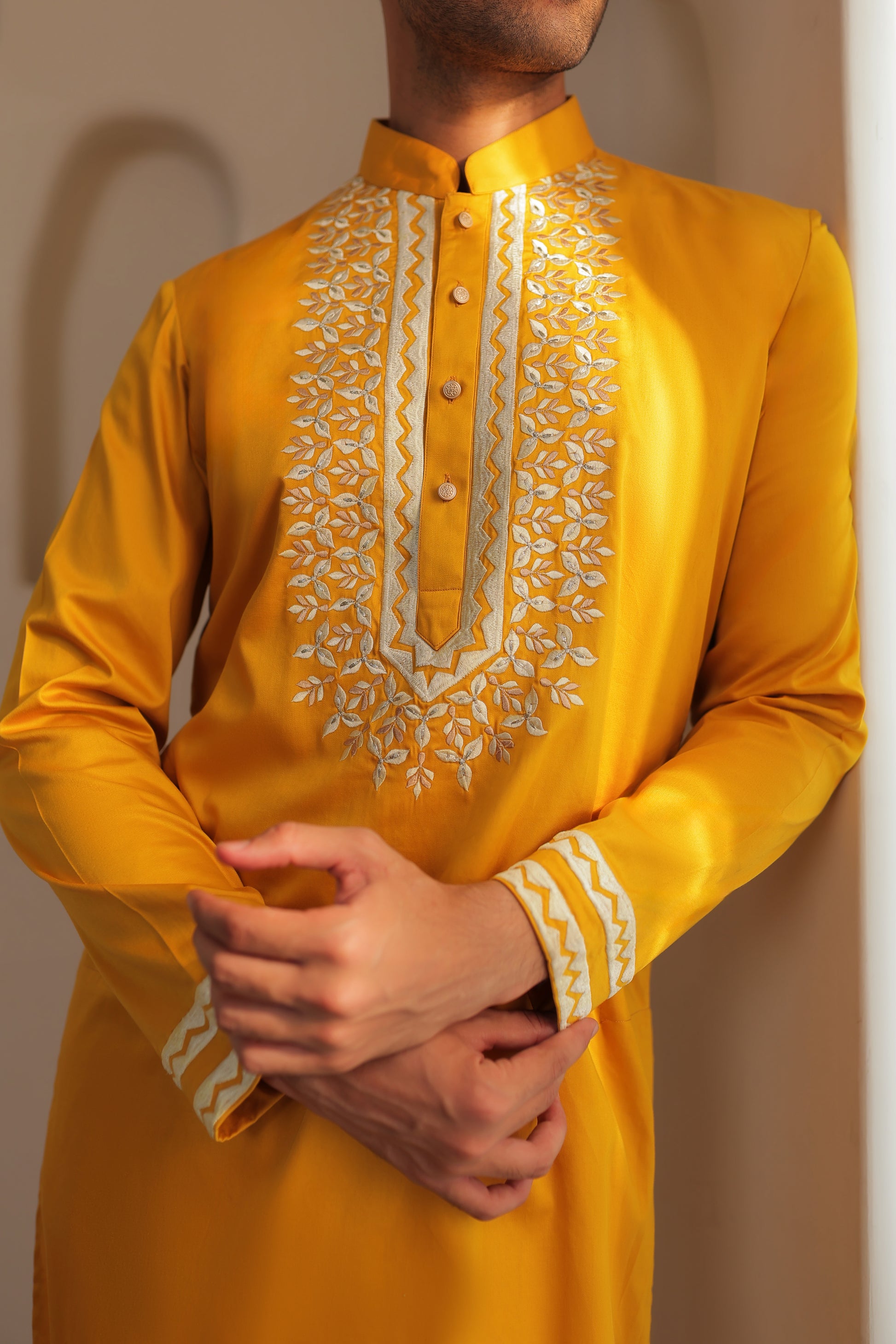 Rooted in tradition, elevated with craftsmanship - the Earth Ember kurta draws from the rustic beauty of baked clay and sunlit earth. The warm mustard hue is perfectly complemented by textured embroidery inspired by terracotta art, adding depth and a handcrafted feel. Subtle yet distinctive, this piece is ideal for festive daywear, mehendi functions, or cultural gatherings where tone, texture, and authenticity come together in perfect harmony.