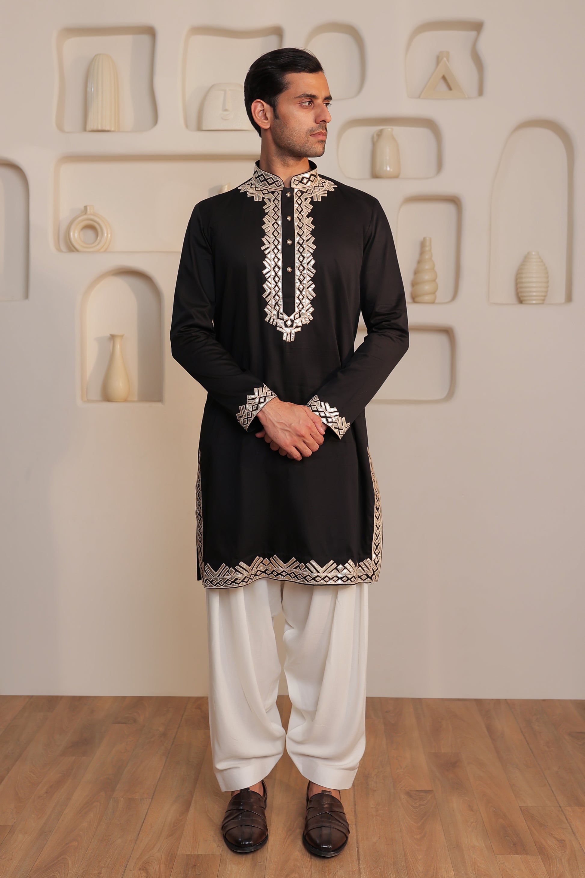 Where tradition meets bold innovation - the Noir Edge kurta is crafted in a lustrous black satin finish that exudes quiet luxury. Sharp leather accents elevate the silhouette, adding a contemporary, structured feel to a classic form. Designed for the modern man who embraces both heritage and high fashion, this kurta is ideal for evening receptions, cocktail functions, or curated festive moments that call for confident style with a statement edge.