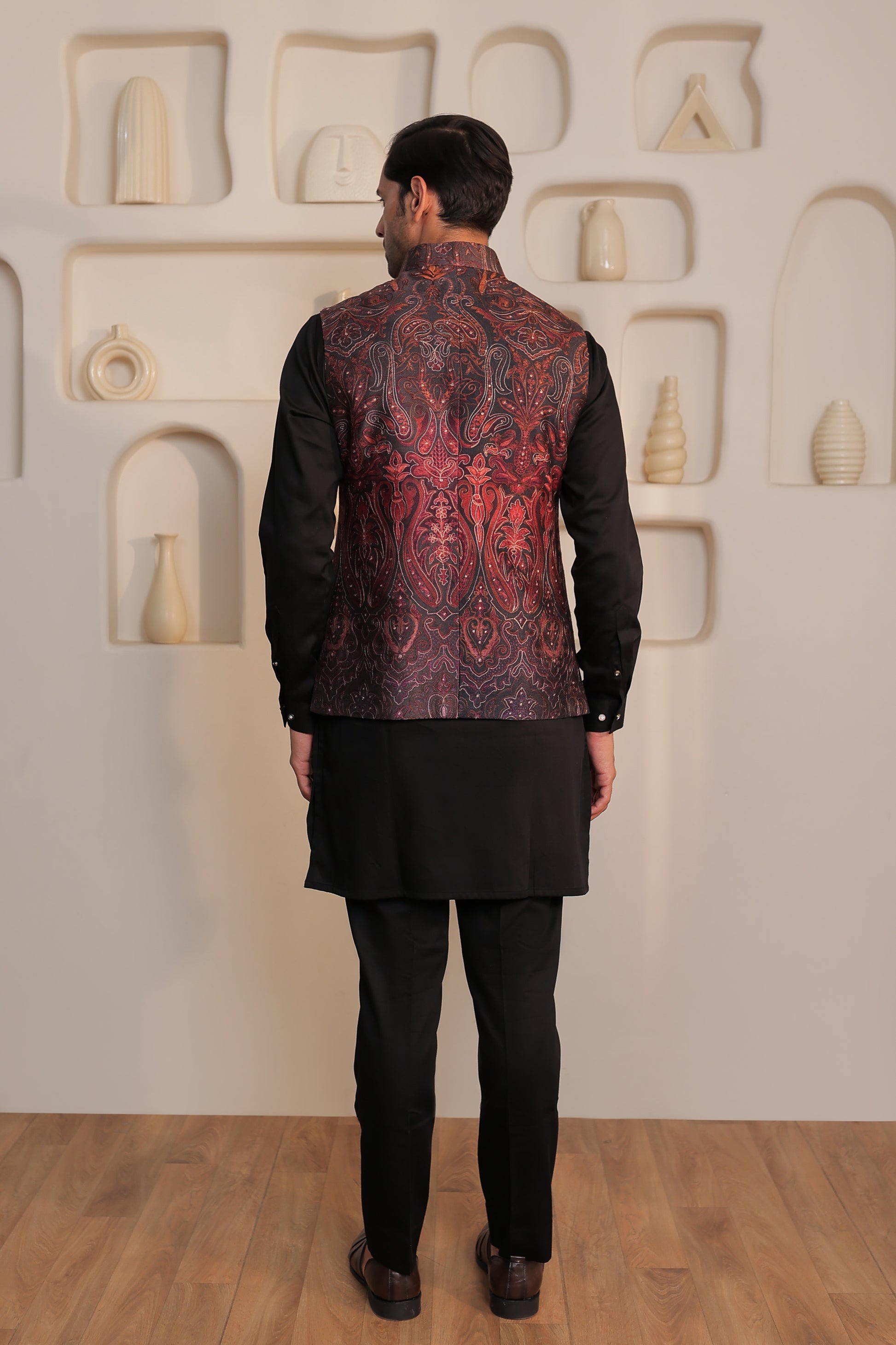 A refined expression of timeless design, Paisley Noir is crafted in deep black and adorned with intricate wine-hued paisley embroidery. The rich contrast adds texture and depth, while the tailored silhouette keeps the look sharp and contemporary. Ideal for festive evenings, receptions, or modern groomsmen, this bundi set delivers quiet sophistication with a standout finish.
