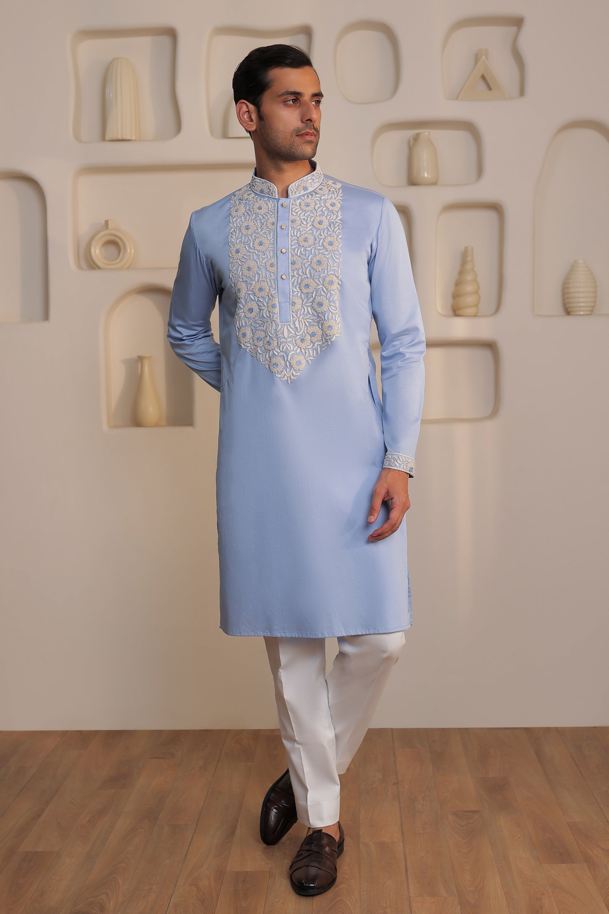 Effortless grace in every thread - the Sky Bloom kurta is crafted in a serene powder blue, elevated with delicate floral embroidery that whispers sophistication. The tonal threadwork adds quiet texture without overwhelming the minimal aesthetic, making it perfect for daytime celebrations, intimate festive gatherings, or refined pre-wedding functions. Light, breathable, and tailored to flatter, this kurta is a poetic blend of tradition and modern finesse.